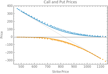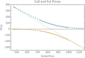 g0=Plot[curprice-k,{k,500,1100},PlotStyle->{Black,Thin}];g1=ListPlot[{callPrices,{#1,-#2}&@@@putPrices},PlotRange->All,Frame->True,FrameLabel->{"Strike Price","Price"},PlotLabel->"Call and Put Prices"];Show[g1,g0]