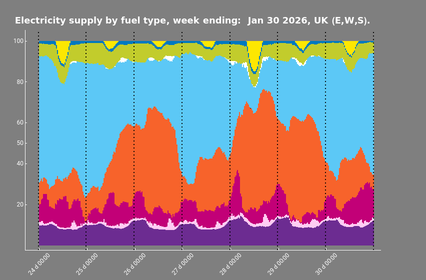 chartTitle=StringJoin[{"Electricity supply by fuel type, week ending: ",stringDate,", UK (E,W,S)."}];glBool=2;glOptions={None,{0,48,96,144,192,240,288,336}};id=glOptions[[2]]+1;id=id[[;;-2]];yTicks={20,40,50,60,80,100};newDates=datesLBlanks[[id]];newDates=Rotate[#,Pi/4]&/@newDates;xTicks=Partition[Riffle[id,newDates],2];interactive=Overlay[{Show[BarChart[dataReorder,BarSpacingAutomatic,ChartLayout"Stacked",ChartStyle{EdgeForm[],styleColours},AxesFalse,Method{"GridLinesInFront"True},GridLinesStyleDirective[Black,Medium,Thick,Dashing[Small]],GridLines{glOptions[[glBool]],None},ImageSize{Automatic,560},ImagePadding{{50,90},{60,60}},BackgroundRGBColor[{0.5,0.5,0.5}],Epilog{{},Text[Style[chartTitle,18,Bold,White],{155,110}]}],FrameStyleDirective[White,12],Frame{{True,None},{True,None}},FrameTicks{{yTicks,None},{xTicks,None}}],legend},Alignment{Right,Center}]