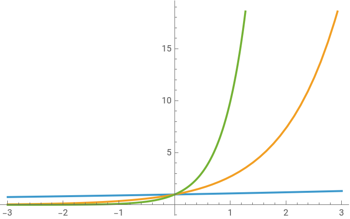 Plot[{1.1^x,Exp[x],10^x},{x,-3,3}]