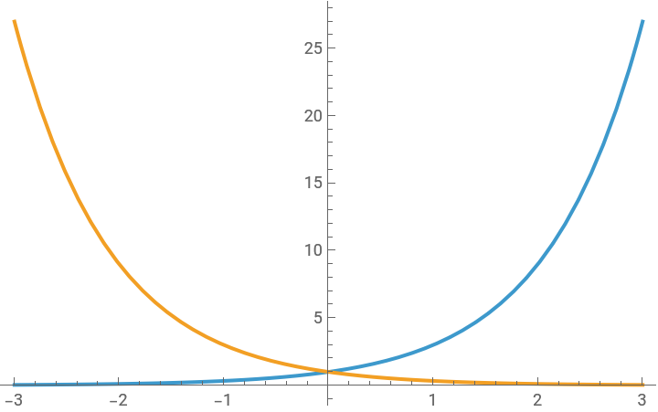 Plot[{3^x,(1/3)^x},{x,-3,3}]