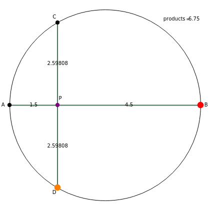 This Demonstration illustrates the power of a point theorem in geometry, which states that if two chords and in a circle intersect at a point , then . This is also known as the intersecting chords theorem.