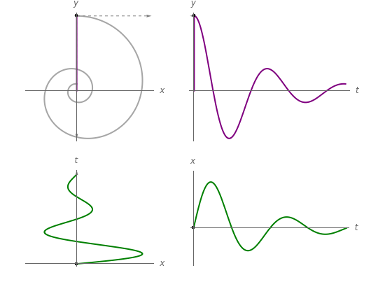 Explore a few examples of parametric curves in two dimensions. See how the and functions relate to the final drawn curve in the top-left corner. Also, select "derivatives" to see how and relate to , the slope of the parametric curve. The concavity, as given by , is also shown, in contrast to the rate of change of slope with respect to time. (Select "values" and "derivatives" to see all derivative values.)