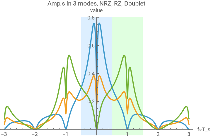 Plot[{Abs[X_NRZ[f/T_s]],Abs[X_RZ[f/T_s]],Abs[X_dbl[f/T_s]]},{f,-3,3},Prolog->{LightBlue,Rectangle[{-1/2,-1},{1/2,2}],LightGreen,Rectangle[{1/2,-1},{3/2,2}]},AxesLabel->{"f×T_s","value"},PlotLegends->{"NRZ","RZ","Doublet"},PlotLabel->"Amp.s in 3 modes, NRZ, RZ, Doublet"]