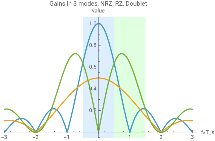Plot[{Abs[G_NRZ[f/T_s]],Abs[G_RZ[f/T_s]],Abs[G_dbl[f/T_s]]},{f,-3,3},Prolog->{LightBlue,Rectangle[{-1/2,-1},{1/2,2}],LightGreen,Rectangle[{1/2,-1},{3/2,2}]},AxesLabel->{"f×T_s","value"},PlotLegends->{"NRZ","RZ","Doublet"},PlotLabel->"Gains in 3 modes, NRZ, RZ, Doublet"]
