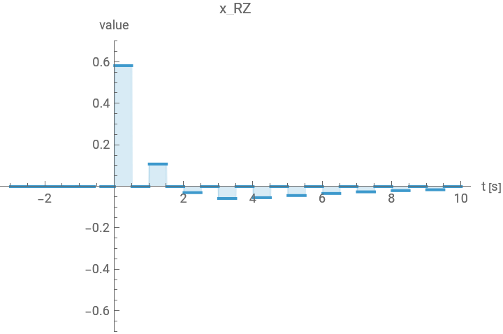 Plot[x_RZ[t],{t,-3,10},Filling->Axis,PlotRange->{-0.7,0.7},AxesLabel->{"t [s]","value"},PlotLabel->"x_RZ"]