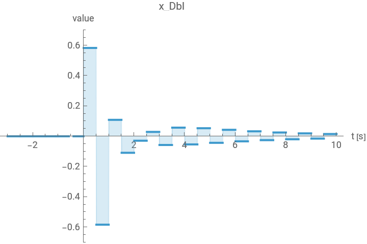 Plot[x_Dbl[t],{t,-3,10},Filling->Axis,PlotRange->{-0.7,0.7},AxesLabel->{"t [s]","value"},PlotLabel->"x_Dbl"]