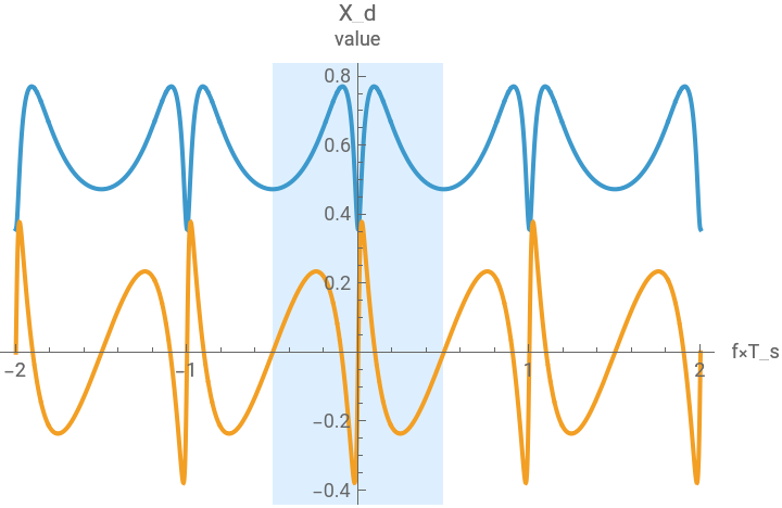 Plot[{Abs[X_d[f/T_s]],Arg[X_d[f/T_s]]},{f,-2,2},PlotRange->Full,Prolog->{LightBlue,Rectangle[{-1/2,-1},{1/2,2}]},AxesLabel->{"f×T_s","value"},PlotLegends->{"abs.","arg."},PlotLabel->"X_d"]