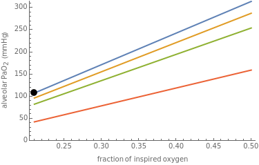 This Demonstration shows the effects of changes in altitude on alveolar oxygen pressure using the alveolar gas equation: =×(-O)-1.2, where is the alveolar partial pressure in mmHg, is the fraction of inspired oxygen, and O is the vapor pressure of water at 37 °C, 47 mmHg.