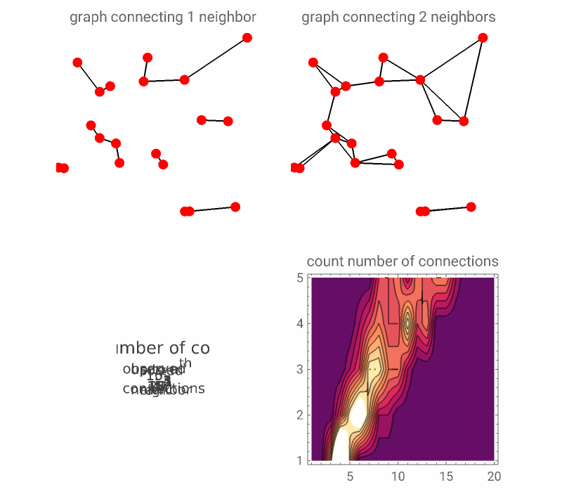 The contour plot at the lower right shows the statistics for the number of connections, a PDF in terms of counting the occurrences of different values for resulting connections. It uses the same results as in the ranked plot, but counts the occurrence of each value of connection. A ridge appears, representing the maximum count of connections for each nearest neighbor number. This ridge is more diffuse for larger values of connections as there is statistical variation in the clustering, with the larger reaches from successively farther neighbor connections. Finally both plots reach a maximum plateau at connections. When enough neighbors are connected the points become connected to every other point.
