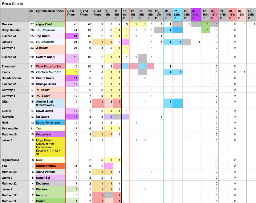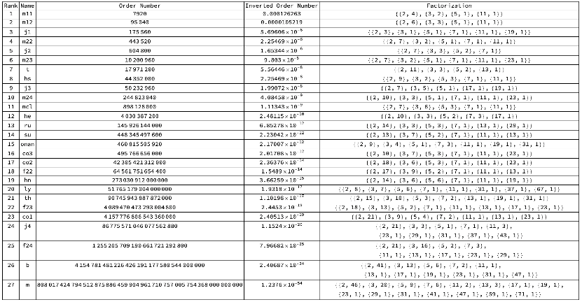 - Properties: Integer formulas like the taxi cab formulas, particularly Elkies taxi cab power of 5 formula, are key to understanding the information structures embedded in the 26 Non-Abelian Lie Sporadic Groups and 1 Non-Abelian Non-Lie Group (the Tits Groups). For example, the number of elements of quantitative relationship between the Simple Sporadic Groups Fischer 22 Group (F22) and Suzuki Group (Suz) is 144 (| Suz | * 144 = | F22 |). The Suzuki Sporadic Simple Group represents the information center of the down quark and the Fischer 22 Sporadic Simple Group represents the information center of the strange quark. See Appendix Table 3. Of note also, 84 is the limit superior of the largest finite subgroup of the mapping class group of a genus 𝑔 surface divided by 𝑔. A hepteract is a seven-dimensional hypercube with 84 penteract 5-faces. Under Hurwitz’s automorphisms theorem, a smooth connected Riemann surface 𝑋 of genus 𝑔>1 will contain an automorphism group