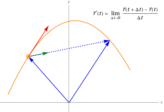 This Demonstration shows the definition of a derivative for a vector-valued function in two dimensions. In the limit as approaches zero, the difference quotient vector (in green) approaches the tangent vector to the curve (in red).