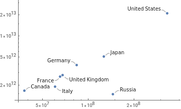 ListPlot[{"Population","GDP"}]["Name"],ScalingFunctions{"Log","Log"}