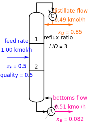 This Demonstration shows how to determine the number of equilibrium stages needed for a two-component (methanol/water) separation in a counter-current distillation column. It also shows the optimal location to feed the binary mixture into the column. Check "view process flow diagram" to show the - diagram on the left and the process flow diagram on the right. When that box is not checked, a larger - diagram is shown and you can move the cursor over the curves to see labels. The column feed has a methanol mole fraction of =0.5 and a quality of 0.5. The condenser is a total condenser, so it is not considered an equilibrium stage. Set the external reflux ratio , as well as the methanol mole fractions in the distillate and bottoms streams, with sliders. The number of stages is determined by stepping off stages starting at ; the partial reboiler is an equilibrium stage. The number of equilibrium stages depends on the compositions of the exiting streams and the reflux ratio. The stages can be numbered with the first stage above the reboiler (bottom to top) or with the first stage at the condenser, use buttons to switch between these numbering options. Note that the determined by stepping off stages is often lower than the desired because reaching the exact value of the desired would require a partial stage, which is not possible.