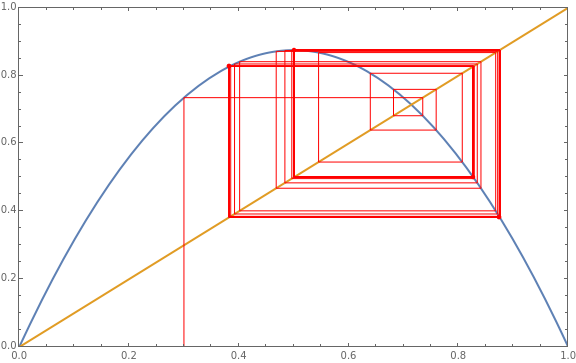 The logistic map, a popular example of a period-doubling cascade developing to chaos, obeys the recurrence =r(1-). The red cobweb diagram traces out the orbit of for a given value of the parameter . The orbit is chaotic when the cobweb diagram becomes dense.