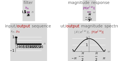 The three sets of controls let you vary the path of the input sequence. If you choose neither the upsampler nor the filter, the sequence goes through the system unchanged. You can also choose to show the effect of filtering alone on the input sequence. Likewise, the effect of upsampling alone on the input sequence can be shown. Choosing both the upsampler and the filter shows the effect of filtering an upsampled input sequence (this is done only for ). Input sequence/spectrum are shown in black, and the output sequence/spectrum in red. The top two graphics show the chosen half-band filter in purple (lowpass/highpass and the choice of Haar, Daubechies 4, Daubechies 6, and a simple symmetric pair) and its magnitude response. You can also choose to show the envelopes of the sequences.