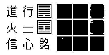 TestSyms="道行火土信心銘";TestSymBitmaps=RastToBitmap[Rasterize[Style[#,Medium]],16]&/@Characters[TestSyms];