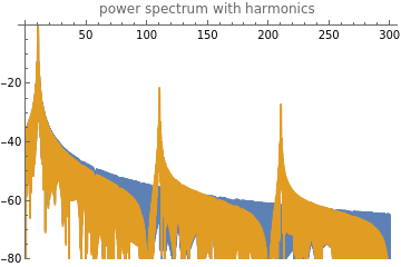 Plot[{20Log10[Abs[X[f]]],20Log10[Abs[X_d[f]]]},{f,0,3/gT_samp},PlotRange->{-80,0},PlotLegends->"Expressions",PlotLabel->"power spectrum with harmonics"]