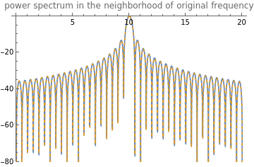 Plot[{20Log10[Abs[X[f]]],20Log10[Abs[X_d[f]]]},{f,0,2g_f},PlotRange->{-80,0},PlotStyle->{Default,Dashed},PlotLegends->"Expressions",PlotLabel->"power spectrum in the neighborhood of original frequency"]