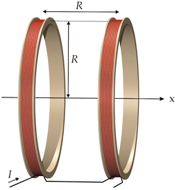What if we need higher levels of homogeneity? There is an improved version of the Helmholz coil, called a Maxwell coil, that uses 3 rather than 2 loops, and those loops are placed on the surface of a virtual sphere: