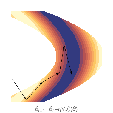 When working with the gradient descent, we assume a flat or euclidean parameter space. The algorithm won’t take in account the geometry intrinsic to the cost function which would lead to an inefficient search of the minimal value, as we can see in the step definition, it only depends on the direction of the negative gradient and the learning rate eta.