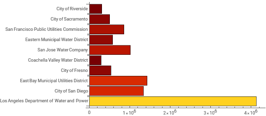 BarChart[top10[All,"PopulationServed"],ColorFunction->"SolarColors",ChartLabelsNormal[top10[All,"SupplierName"]],BarOriginLeft]