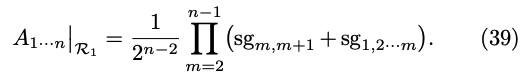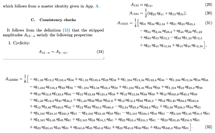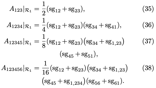 (*Eqs.35-38*)Eq["simple",3]=1/2*(sg[{1},{2}]+sg[{2},{3}]);Eq["simple",4]=1/4*(sg[{1},{2}]+sg[{2},{3}])*(sg[{3},{4}]+sg[{4},{1}]);Eq["simple",5]=1/8*(sg[{1},{2}]+sg[{2},{3}])*(sg[{3},{4}]+sg[{1},{2,3}])*(sg[{4},{5}]+sg[{5},{1}]);Eq["simple",6]=1/16*(sg[{1},{2}]+sg[{2},{3}])*(sg[{3},{4}]+sg[{1},{2,3}])*(sg[{4},{5}]+sg[{1},{2,3,4}])*(sg[{5},{6}]+sg[{6},{1}]);