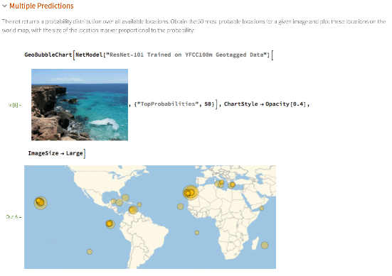 Voici un exemple Chaque réseau publié dans Wolfram Neural Net Repository dispose de sa propre page web. Voici, par exemple, la page d’un réseau qui prédit la géo-position d’une image :
