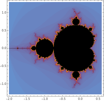 Wolfram言語では,最も簡単なコードでこれらのフラクタルを描画できます.例えば,以下の関数はこのビデオの作成に役立ちました.マンデルブロ集合をプロットします:
