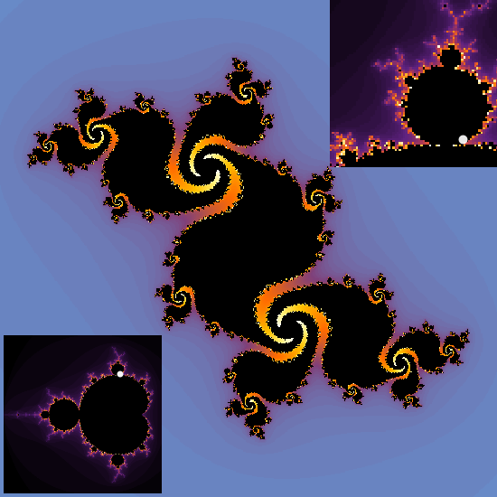 Manipulate[JuliaSetPlot[Complex@@bsp[t],ImageSize->grSZ{1,1},PerformanceGoal->"Quality",PlotRange->1.4,Frame->False,Epilog->{Inset[mand[bsp[t]],{Right,Top},{Right,Top}],Inset[mand2[bsp[t]],{Left,Bottom},{Left,Bottom}]}],{t,0,1},SaveDefinitions->True]