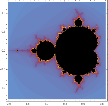 在 Wolfram 語言中,最簡單的程式碼就可以繪製這些分形。例如,下列函數有助於製作這個影片。繪製曼德布洛特集: