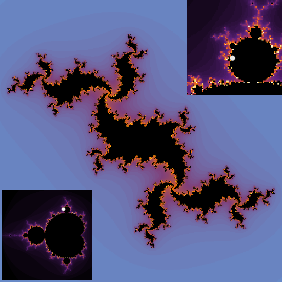 Manipulate[JuliaSetPlot[Complex@@bsp[t],ImageSize->grSZ{1,1},PerformanceGoal->"Quality",PlotRange->1.4,Frame->False,Epilog->{Inset[mand[bsp[t]],{Right,Top},{Right,Top}],Inset[mand2[bsp[t]],{Left,Bottom},{Left,Bottom}]}],{t,0,1},SaveDefinitions->True]