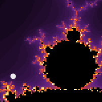 mand[p_]:=MandelbrotSetPlot[ColorFunction->"SunsetColors",Frame->False,ImageSize->grSZ/3.,Epilog->{White,Disk[p,.01]},PlotRange->{{-.4,0},{.6,1}},PerformanceGoal->"Quality"]mand[{-.35,.7}]