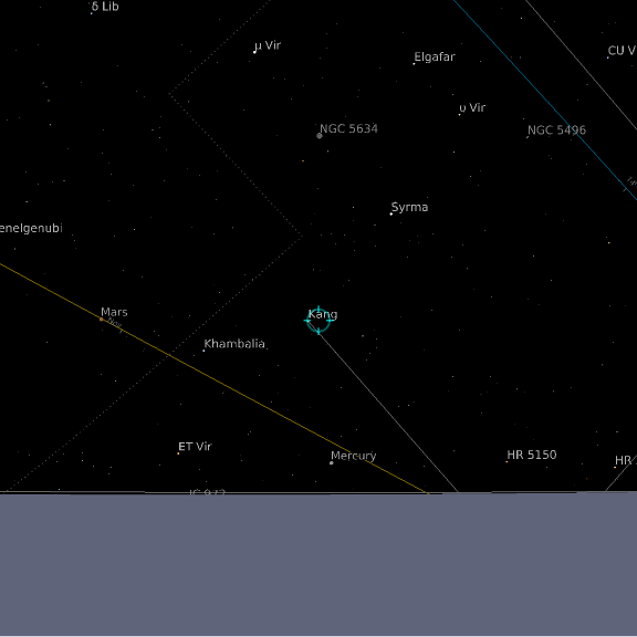 Nous pouvons alors simuler que le rover a vu que la comète traversait la constellation Boötes le 3 octobre. Au départ, la comète était sous l’horizon, mais au fil du temps, elle s’est élevée. Nous utilisons le cadre « écliptique » pour que le mouvement soit essentiellement horizontal, même si la surface de Mars semble inclinée. La grille correspond aux coordonnées écliptiques, avec des lignes séparées d’un degré :