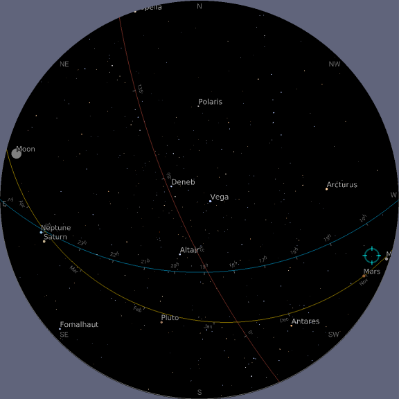 Nous pouvons même choisir un lieu d’observation plus exotique, depuis le centre de Cérès, par exemple. La ligne bleue représente le plan équatorial de la Terre, qui ne joue aucun rôle dans ce cas puisque nous n’observons pas depuis la Terre.