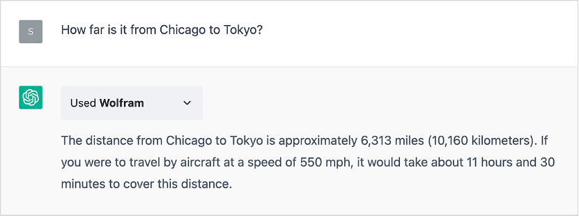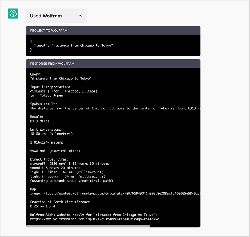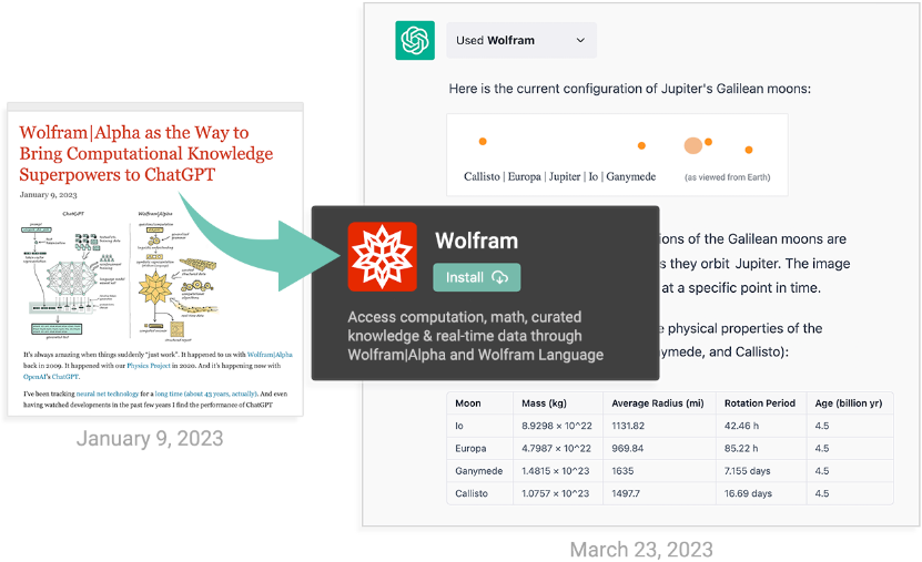 Ce qui est particulièrement important ici, c’est que ChatGPT ne nous utilise pas seulement pour effectuer une opération « sans issue » telle que l’affichage du contenu d’une page Web. Nous agissons plutôt comme un véritable « implant cérébral » pour ChatGPT, qui nous demande des choses chaque fois qu’il en a besoin, et nous lui donnons des réponses qu’il peut intégrer dans ce qu’il est en train de faire. C’est assez impressionnant à voir en action. Et, bien qu’il y ait encore beaucoup de travail à faire, ce qui est déjà en place contribue grandement (entre autres) à donner à ChatGPT la capacité de fournir des connaissances et des données précises, ainsi que des calculs corrects et non triviaux.