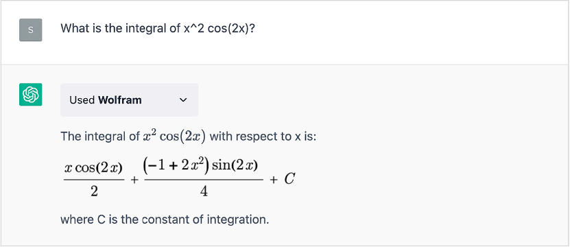 Pour activer la fonctionnalité décrite ici, sélectionnez et installez Wolfram plugin à partir de ChatGPT. Veuillez prendre note que cette fonctionnalité n’est pour l’instant disponible que pour certains utilisateurs de ChatGPT Plus. Si vous souhaitez en savoir plus, veuillez consulter l’annonce d’OpenAI.