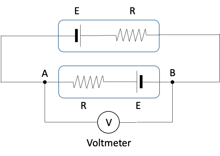 Two batteries are connected in series as shown. Each battery exhibits a potential E with an internal resistance R. What is the voltage measured by a voltmeter across nets A, B?