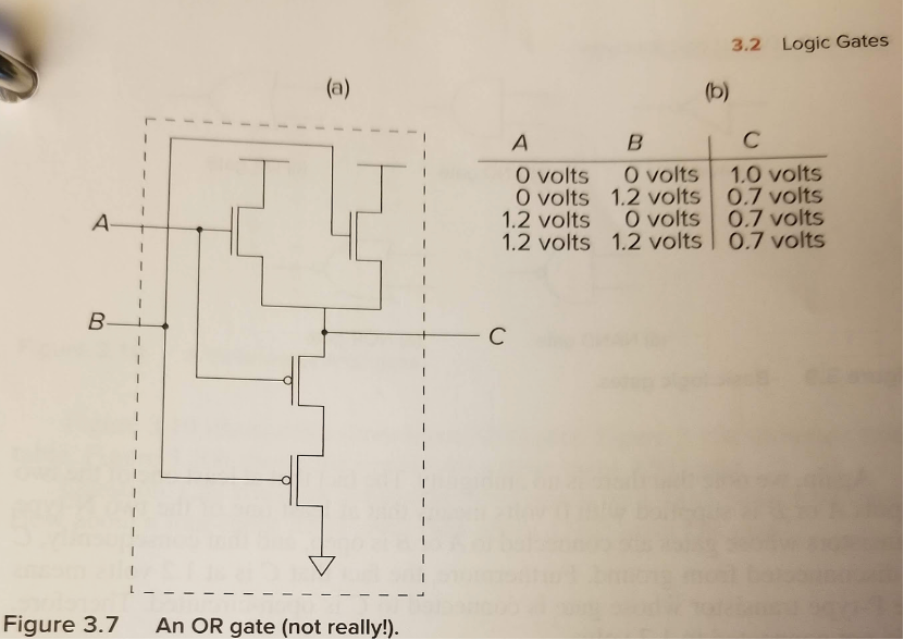 The truth table in Figure 3.7 (b) row 1 is incorrect. The authors are saying that when two MOS devices are stacked the voltage across the devices will be the sum of their individual threshold voltage (VTH). Row 1 specified in terms of the input voltage (V) should read,A B | C0 0 | 0.5