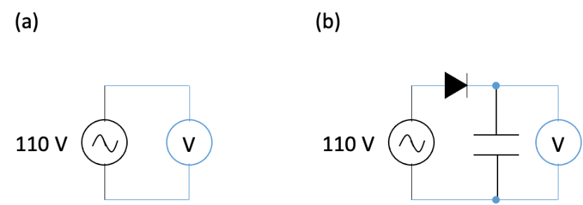 (a) A multimeter reads 110 V on the AC mains. (b) When the same multimeter is connected across a diode-C circuit, it will read .... V.