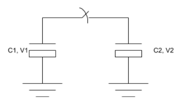 Given two capacitors, each of capacitance C what is the total energy in the capacitors, before (Ei) and after (Ef) closing the switch? The switch is ideal, having no parasitic C, R or L.
