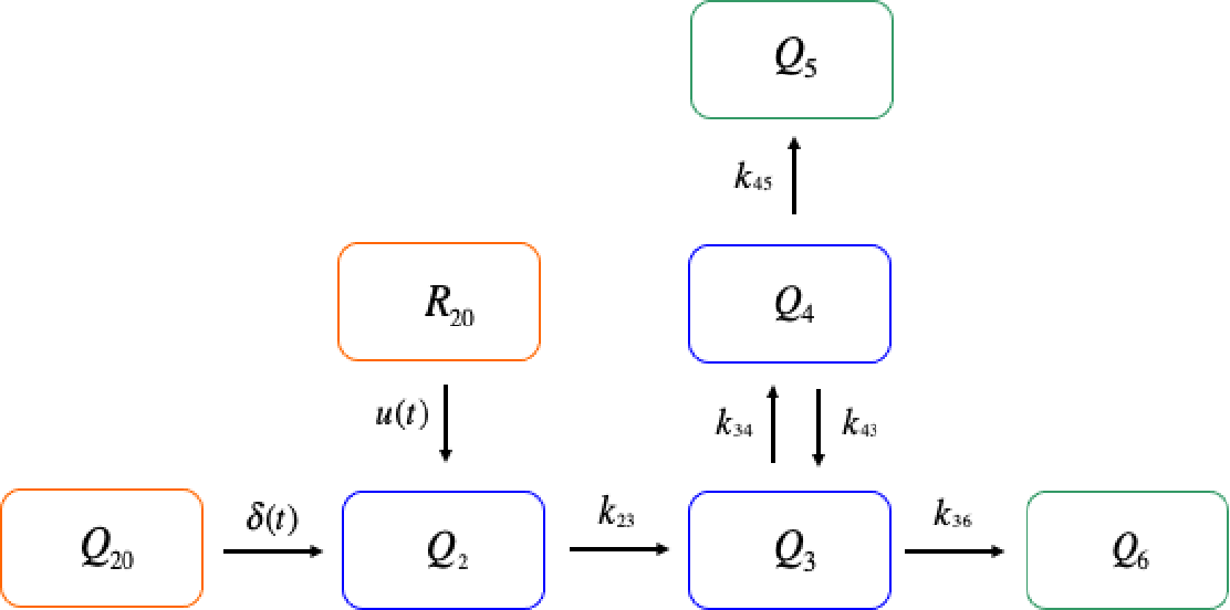 La matrice B fixe les signaux d’entrée qui s’ajoutent aux conditions initiales entrées séparément.La matrice D fixe l'approvisionnement direct du signal de sortie.Les matrices C et D sont évidemment inutiles ou entièrement égales à 0 quand toutes les sorties sont traitées comme des compartiments.