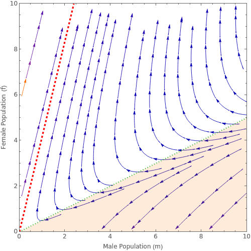 Manipulate[Module[{fDot,mDot,poly,roots,stableRoots,rStar,rIso,endPointStar,endPointIso},(*1.DefinetheSystemDynamics*)fDot=phi1*(f/m)-phi2*(m/f);mDot=mu1*(f/m)-mu2*(m/f);(*2.FindtheEquilibriumRatior=f/m*)(*Thecubicpolynomialgoverningtheratioevolution*)poly[r_]:=-mu1*r^3+phi1*r^2+mu2*r-phi2;(*Solveforpositiverealroots*)roots=r/.NSolve[{poly[r]==0,r>0},r];(*FilterforSTABLErootswhereP'(r)<0*)stableRoots=Select[roots,(D[poly[x],x]/.x->#)<0&];rStar=If[Length[stableRoots]>0,First[stableRoots],None];(*3.DefinetheF-Isocline(GrowthBoundary)*)rIso=Sqrt[phi2/phi1];(*4.GeometricHelper:Findtheedgeintersectionforaliney=k*x*)(*Thisensuresraysarealwaysdrawnacrossthefullvisiblebox*)getEdge[k_]:=If[k<=1,{scale,scale*k},{scale/k,scale}];endPointIso=getEdge[rIso];endPointStar=If[NumberQ[rStar],getEdge[rStar],{0,0}];(*5.GeneratethePlot*)Show[StreamPlot[{mu1*(f/m)-mu2*(m/f),phi1*(f/m)-phi2*(m/f)},{m,0.1,scale},{f,0.1,scale},StreamPoints->density,StreamStyle->{Arrowheads[0.02],Thickness[0.002],GrayLevel[0.4]},Frame->True,FrameLabel->{Style["Male Population (m)",12,FontFamily->"Helvetica"],Style["Female Population (f)",12,FontFamily->"Helvetica"]},LabelStyle->{12,FontFamily->"Helvetica"},ImageSize->500,PlotRange->{{0,scale},{0,scale}},PlotRangePadding->None],(*Overlays*)Graphics[{(*ShadedRegion:FemaleDecline(BelowIsocline)*){Opacity[0.15],Orange,Polygon[{{0,0},{scale,0},endPointIso}]},(*GreenDottedLine:F-Isocline*){Thickness[0.005],Dotted,Darker[Green],Line[{{0,0},endPointIso}]},(*RedDashedLine:StableAttractor(Onlyifitexists)*)If[NumberQ[rStar],{Thickness[0.007],Dashed,Red,Line[{{0,0},endPointStar}]},{}]}],(*Legend*)PlotLegends->Placed[LineLegend[{Directive[Red,Dashed,Thickness[0.005]],Directive[Darker[Green],Dotted,Thickness[0.005]],Directive[Orange,Opacity[0.5]]},{"Stable Attractor","Growth Boundary","Decline Zone"},LegendFunction->Framed,LegendMargins->5],{Right,Top}]]],(*Controls*){{phi1,4.0,"Fem. Influx (ϕ1)"},0.1,10,Appearance->"Labeled"},{{phi2,1.0,"Fem. Exit (ϕ2)"},0.1,10,Appearance->"Labeled"},{{mu1,1.0,"Male Influx (μ1)"},0.1,10,Appearance->"Labeled"},{{mu2,1.0,"Male Exit (μ2)"},0.1,10,Appearance->"Labeled"},Delimiter,{{scale,10,"Max Population"},10,100,10,Appearance->"Labeled"},{{density,20,"Streamline Density"},5,40,1,Appearance->"Labeled"},ControlPlacement->Left,TrackedSymbols:>{phi1,phi2,mu1,mu2,scale,density}]