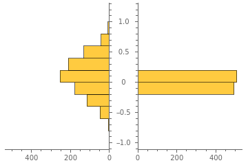 PairedHistogram[Table[similarity[v,RandomChoice[{-1,1},10]],{1000}],Table[similarity[vs1,RandomChoice[{-1,1},10000]],{1000}]]