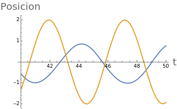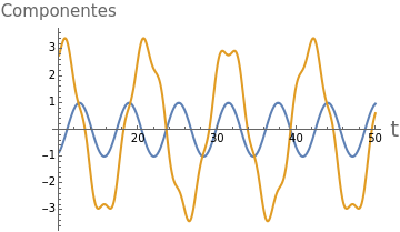 Plot[{a*Cos[w1*t],-a*b/(w2*(2*w1+w2))*Cos[(w1+w2)*t]+a*b/(w2*(2*w1-w2))*Cos[(w1-w2)*t]},{t,10,50},PlotLegends{Style[Superscript["x","(0)"],FontSize15],Style[Superscript["x","(1)"],FontSize15]},AxesLabel{Style["t",FontSize20],Style["Componentes",FontSize15]}]