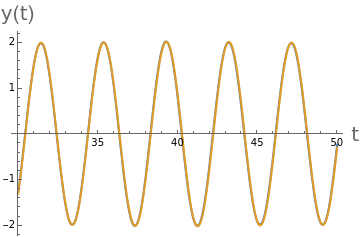 Plot[{b*Cos[w2*t]+α*a^2/(2*w2^2)+α*a^2/(2*(w2^2-4*w1^2))*Cos[2*w1*t],Evaluate[y[t]/.sol]},{t,30,50},PlotLegends{Style["Aproximacion",FontSize15],Style["Numerico",FontSize15]},AxesLabel{Style["t",FontSize20],Style["y(t)",FontSize20]}]