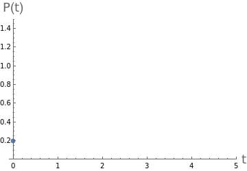 plfp=ListPlot[{{0,0.2}},PlotStylePointSize[0.02],PlotRange{{-0.1,5},{0,1.5}},AxesLabel{Style["t",18],Style["P(t)",18]}]