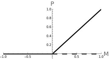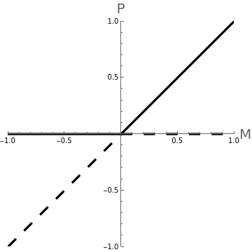 ShowPlot{r,0},{r,0,1},PlotStyle{{Thickness0.01,Black},{Thickness0.01,Black,Dashing0.05}},PlotRange{{-1,1},{-0.1,1}},AxesLabel(Style[#,20]&/@{"M","P"}),AspectRatio,Plot[0,{r,-1,0},PlotStyle{Thickness0.01,Black},PlotRange{{-1,1},{-0.1,1}},AxesLabel(Style[#,20]&/@{"P","M"}),AspectRatio1]