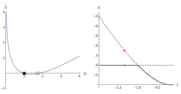 It’s clear here that , is always a fixed point of the system, but for there is also another fixed point. Let’s look at this system as we change . In the following picture, you see that as changes, for the phase portrait on the left and the bifurcation diagram on the right.