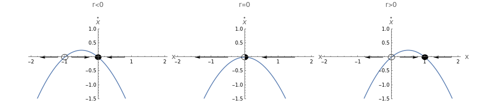 Actually, we should pause for a moment and discuss the examples we’ve been looking at. These “prototypical examples”, like “=rx- ”, and “ =+r ” are called normal forms. You can think of them as the most basic example that exhibits a particular type of bifurcation. Actually there is a lot more to them than that, but that’s the best way to think of them for now. You will see in the exercises for part 3 why they are important.