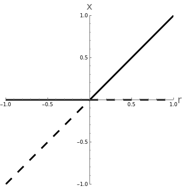 Show[Plot[{r,0},{r,0,1},PlotStyle{{Thickness0.01,Black},{Thickness0.01,Black,Dashing0.05}},PlotRange{{-1,1},{-1,1}},AxesLabel(Style[#,20]&/@{"r","x"}),AspectRatio1],Plot[{0,r},{r,-1,0},PlotStyle{{Thickness0.01,Black},{Thickness0.01,Black,Dashing0.05}},PlotRange{{-1,1},{-1,1}},AxesLabel(Style[#,20]&/@{"r","x"}),AspectRatio1]]